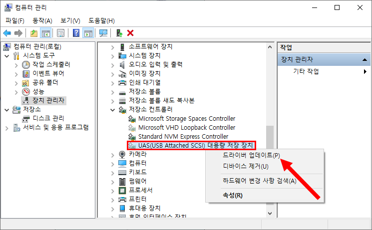 3)저장소 컨트롤러 항목에서 UAS 대용량 저장장치가 표시되는것을 확인할수있다. 항목을 선택하고 마우스 우클릭한후 드라이버 업데이트를 선택한다.