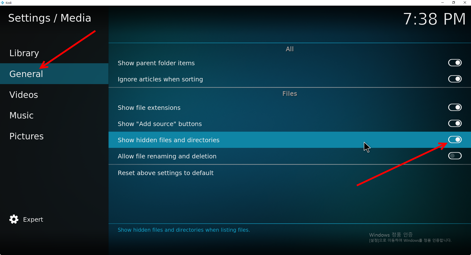 7)일반에서(general) show hidden files and directories를 활성화한다. 이 설정은 숨긴 파일 및 디렉토리를 표시한다.