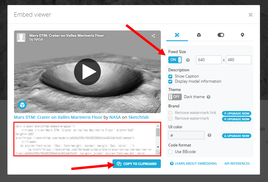 3)우측에서 fixed size를 활성화시키고 사이즈를 설정한후 embed 코드를 복사한다(copy to clipboard)