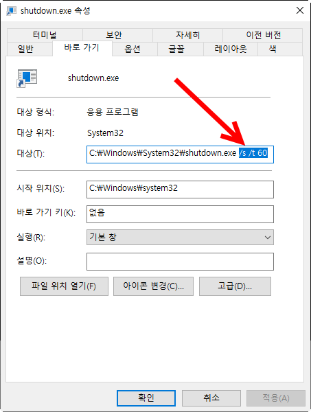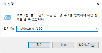 2)shutdown /s /t 시간(초)을 입력한다. 아래 예에서 60초후에 종료한다.