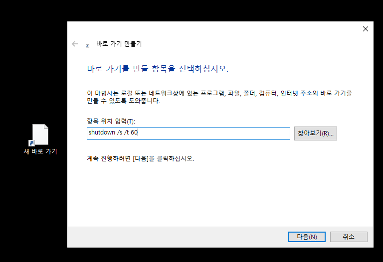 8)바로가기 파일이 생성되며 파일을 실행하면 사용자가 설정한 제한시간 이후에 시스템을 종료한다.