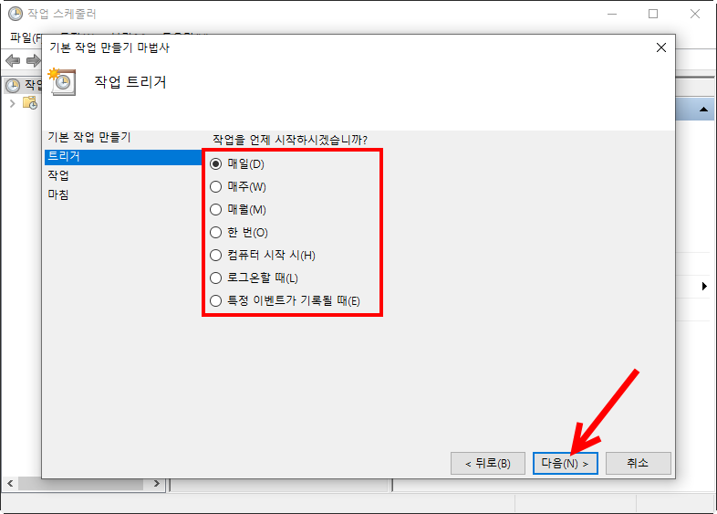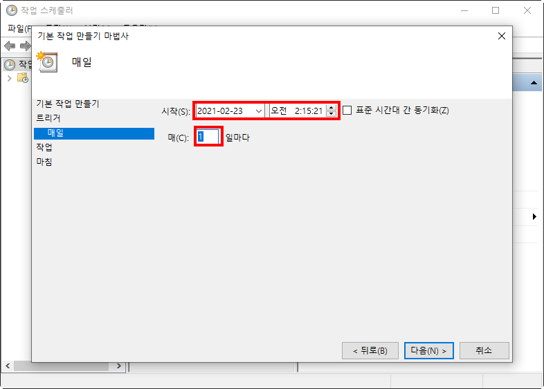 4)작업을 시작할 시간을 설정하고 다음으로 이동한다.