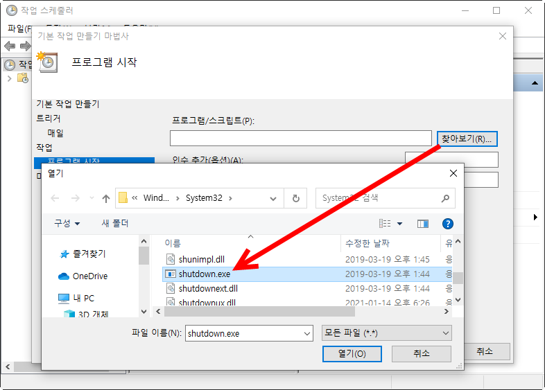 7)프로그램 및 스크립트 찾아보기에서 shutdown.exe 파일을 선택한다.