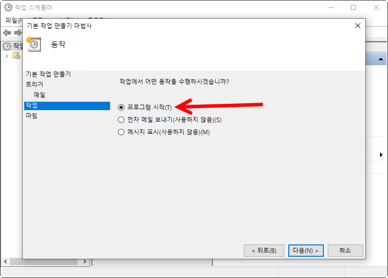 6)수행할 동작에서 프로그램 시작을 선택하고 다음으로 이동한다.