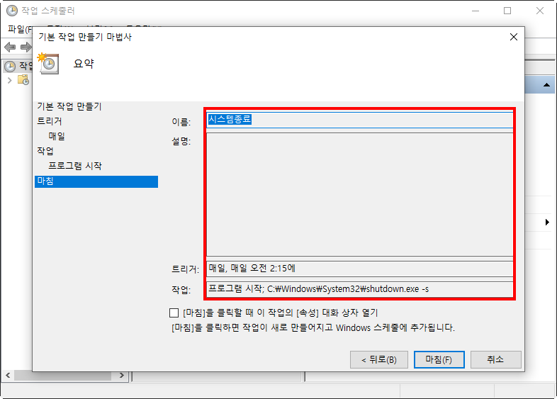 9)설정한 작업을 확인하고 마침을 클릭한다.