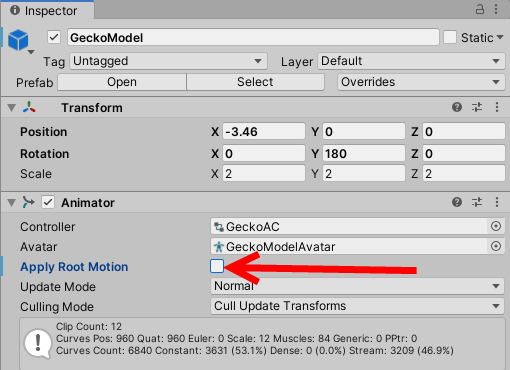 3)게임 오브젝트의 애니메이터 컴포넌트에서 apply root motion을 체크해제한다.