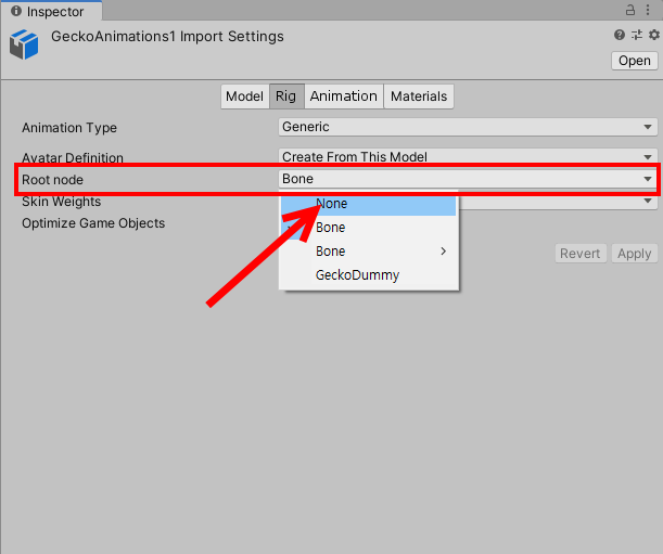 2)애니메이션의 루트모션(root motion)을 비활성화하려면 임포트세팅에서 root node를 none으로 설정한다.