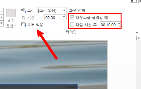 4)전환 탭의 타이밍 그룹에서 마우스를 클릭할 때에 체크하고 모두 적용을 클릭한다.