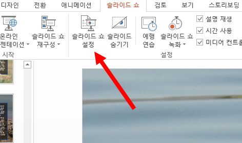 1)슬라이드 쇼 탭의 설정 그룹에서 슬라이드 쇼 설정으로 이동한다.