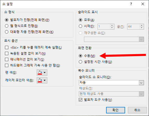 파워포인트에서 화면 전환 수동 설정하기