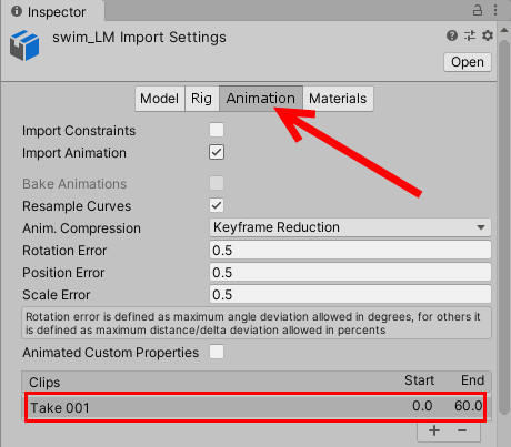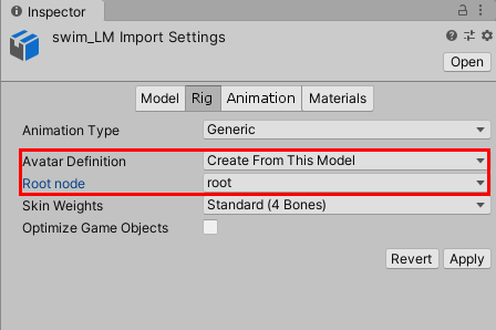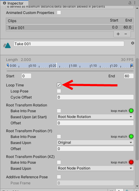 13)animation에서 애니메이션 클립의 loop time에 체크하고 root transform 속성을 설정한다.