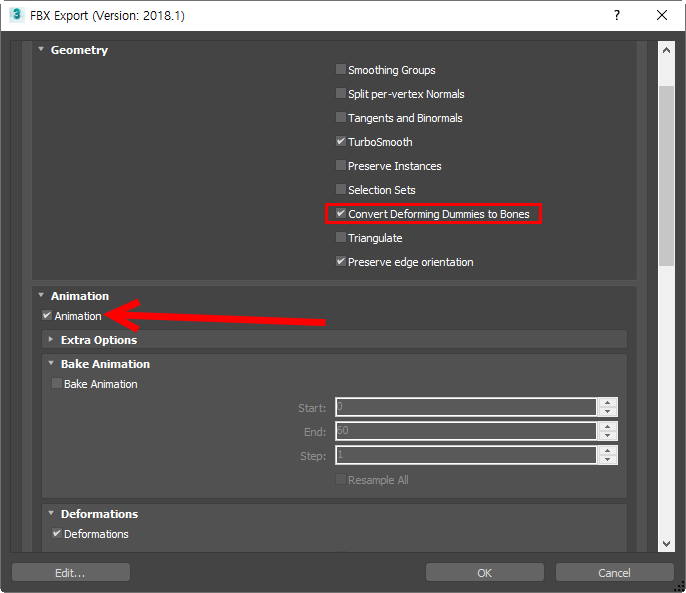 11)convert deforming dummies to bones, animation에 체크하고 확인한다.