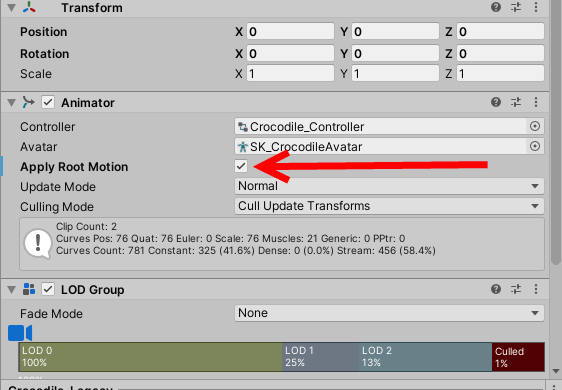 루트 모션(root motion)은 애니메이션에 존재하는 root transform의 모션이 게임오브젝트의 위치(transform position)와 회전(transform rotation)을 제어한다.
