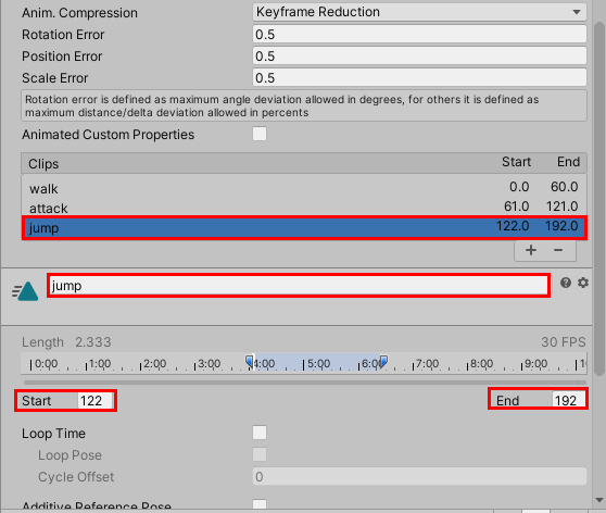 4)클립의 이름을 설정하고 애니메이션의 시작과 끝 프레임을 설정한다.