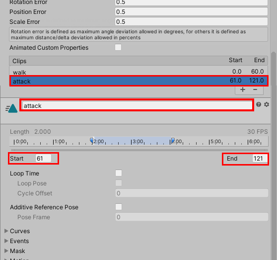 유니티에서 애니메이션 클립 분할하고 프레임 범위설정하기