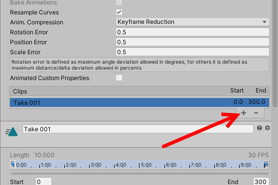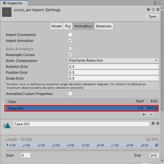 1)애니메이션의 임포트설정에서 한개의 애니메이션 클립이 존재하는것을 확인할수있다(take001)