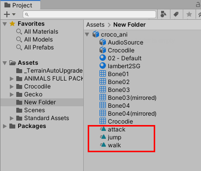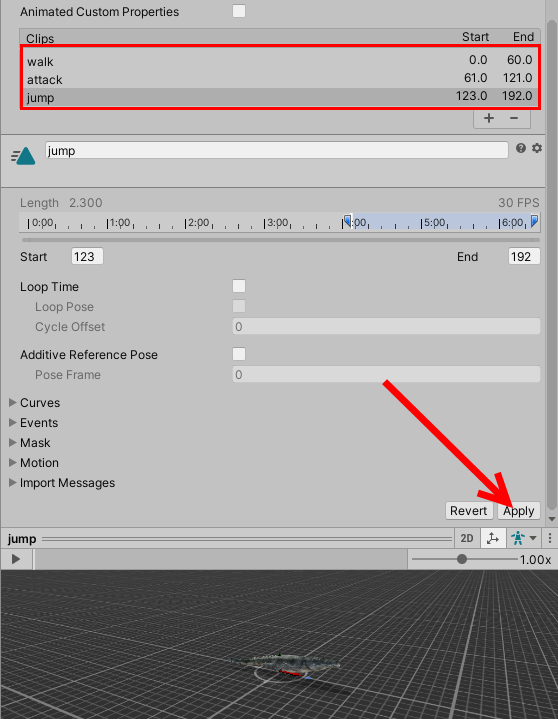 5)apply를 클릭하면 설정을 적용하고 프로젝트의 에셋에서 애니메이션 클립이 추가된것을 확인할수있다.