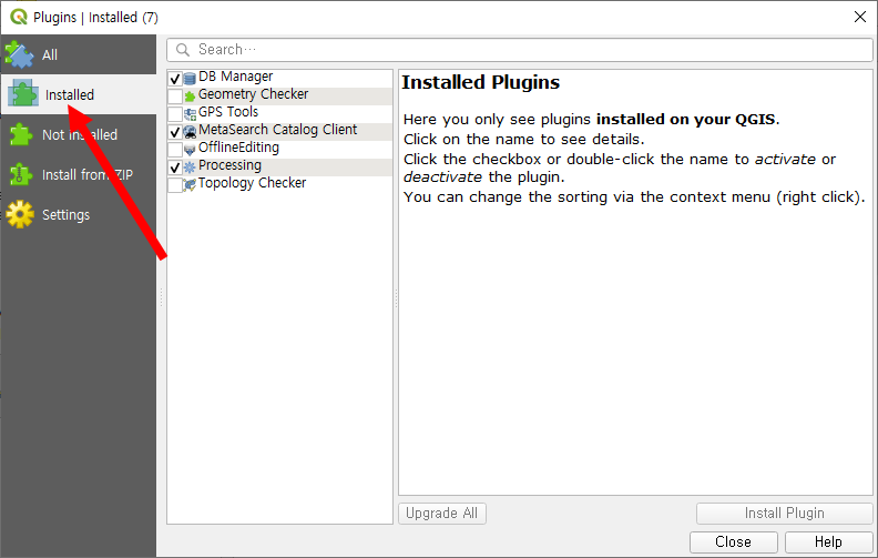 QGIS를 처음 설치할때 같이 설치된 기본 플러그인을 활성화하기