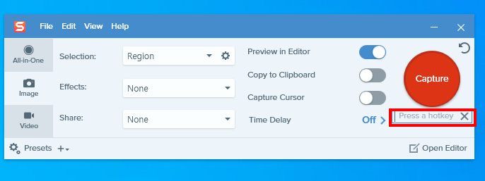 3)capture 버튼 하단에서 캡처 단축키를 설정한다.