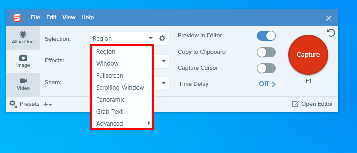 2)캡처할 영역을 선택한다(region, window, fullscreen, scrolling window, panoramic, grab text, advanced)