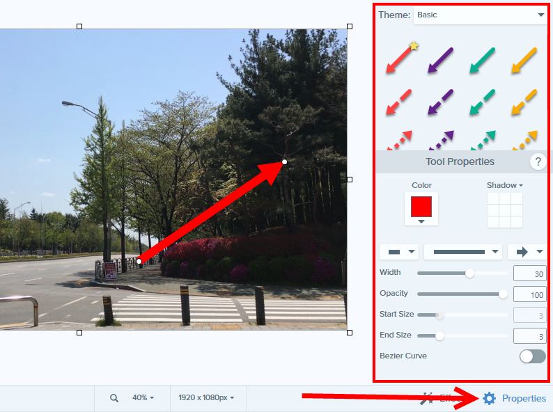 7)도구를 선택하고 properties에서 선택한 도구의 속성 및 옵션을 설정할수있다.