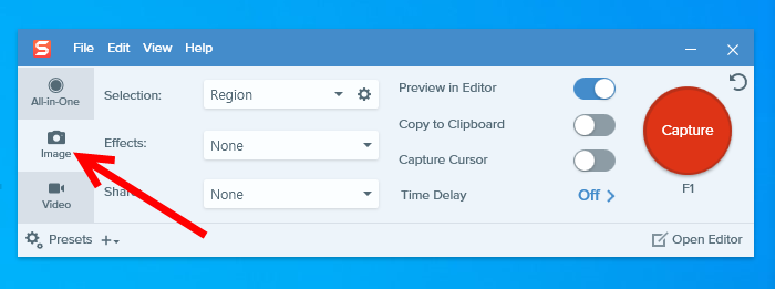 1)snagit에서 이미지 또는 비디오로 캡처 방법을 선택한다.