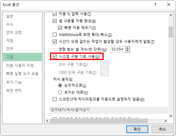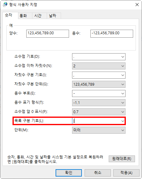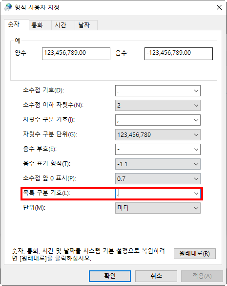 6)목록 구분 기호를 사용자 지정하고 확인한다. 이 설정은 윈도우에서 사용하는 목록 구분 기호를 사용자 지정하는것으로 엑셀에서 csv파일을 저장한 이후에 원래대로를 클릭하여 기본 설정으로 복원한다.