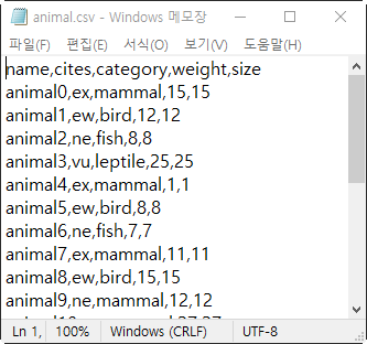 1)엑셀에서 csv 파일을 저장하고 텍스트 편집기에서 확인하면 항목들이 쉼표로 구분되어있는것을 확인할수있다.