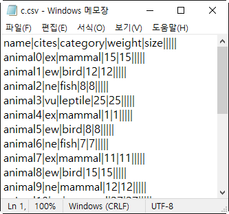 10)csv파일을 내보내기하고 텍스트 편집기에서 확인한다. 윈도우에서 사용자 설정한 구분기호를 확인할수있다.