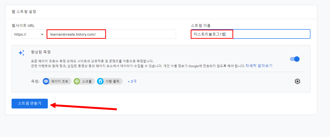 5)웹사이트 URL에 블로그 또는 사이트의 주소를 입력하고 스트림 이름을 설정한후 스트림 만들기를 클릭한다.