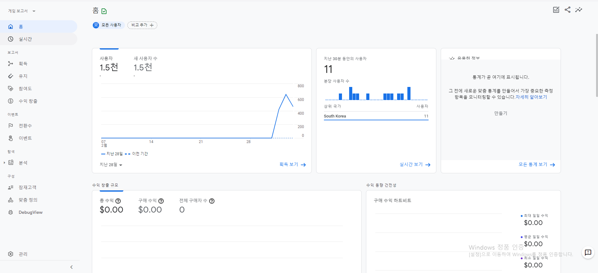 13)일정 시간이 지난후 애널리틱스의 홈 메뉴에서 수집한 데이터가 보고서에 반영되는것을 확인할수있다.