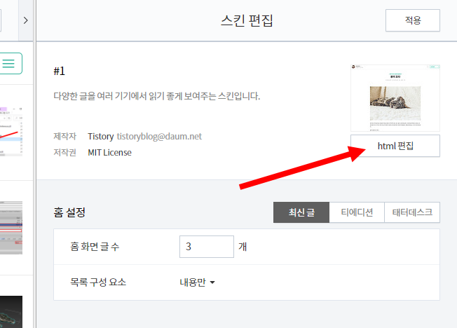 11)블로그 또는 웹사이트의 html 편집으로 이동한다. 티스토리 블로그의 경우 스킨편집을 선택하고 html 편집으로 이동한다.