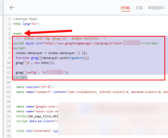 12)html의 <head> 섹션에 복사한 사이트 태그를 붙여넣기한다.