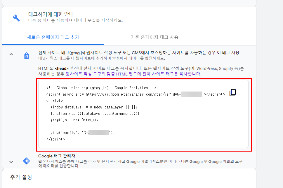 10)전체 사이트 태그(gtag.js)를 복사한다.
