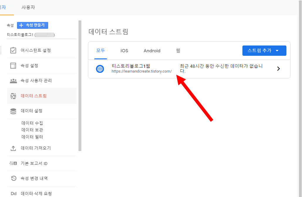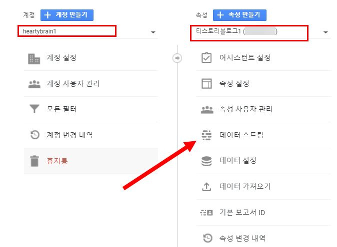 1)계정을 선택하고 속성의 데이터 스트림으로 이동한다.