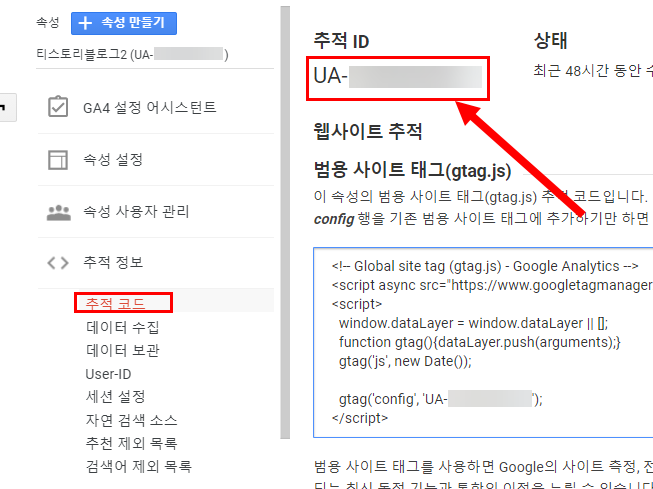 속성의 추적 코드에서 추적 ID를 확인할수있다. 추적 ID는 UA-ID 형식을 사용한다.