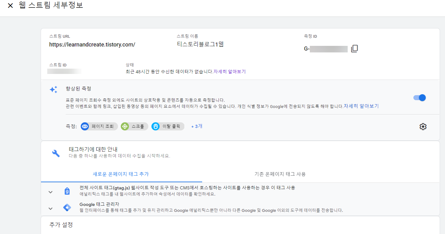 구글 애널리틱스(google analytics)에서 데이터스트림의 추적ID 및 측정ID 확인하기