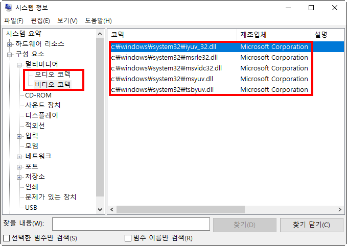 6)시스템 정보(msinfo32)에서 구성요소의 멀티미디어에서 설치된 오디오 및 비디오 코덱을 확인할수있다.