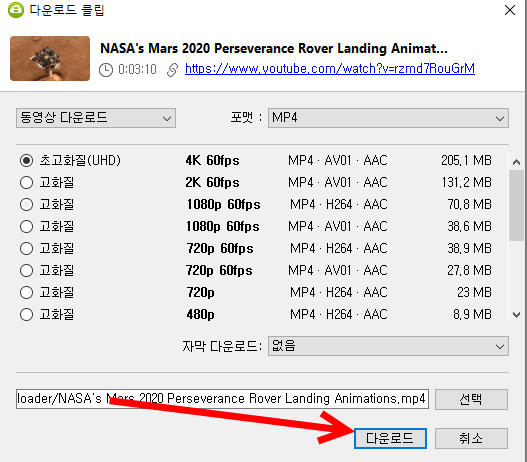 5)동영상 다운로드 옵션을 설정한다. 최대 8k화질의 동영상을 다운로드할수있으며 mp4, mkv 비디오 포맷을 지원한다.