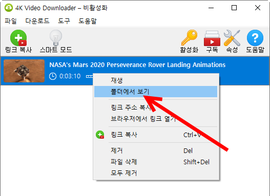 7)다운로드한 항목을 마우스 우클릭한후 폴더에서 보기를 선택한다.