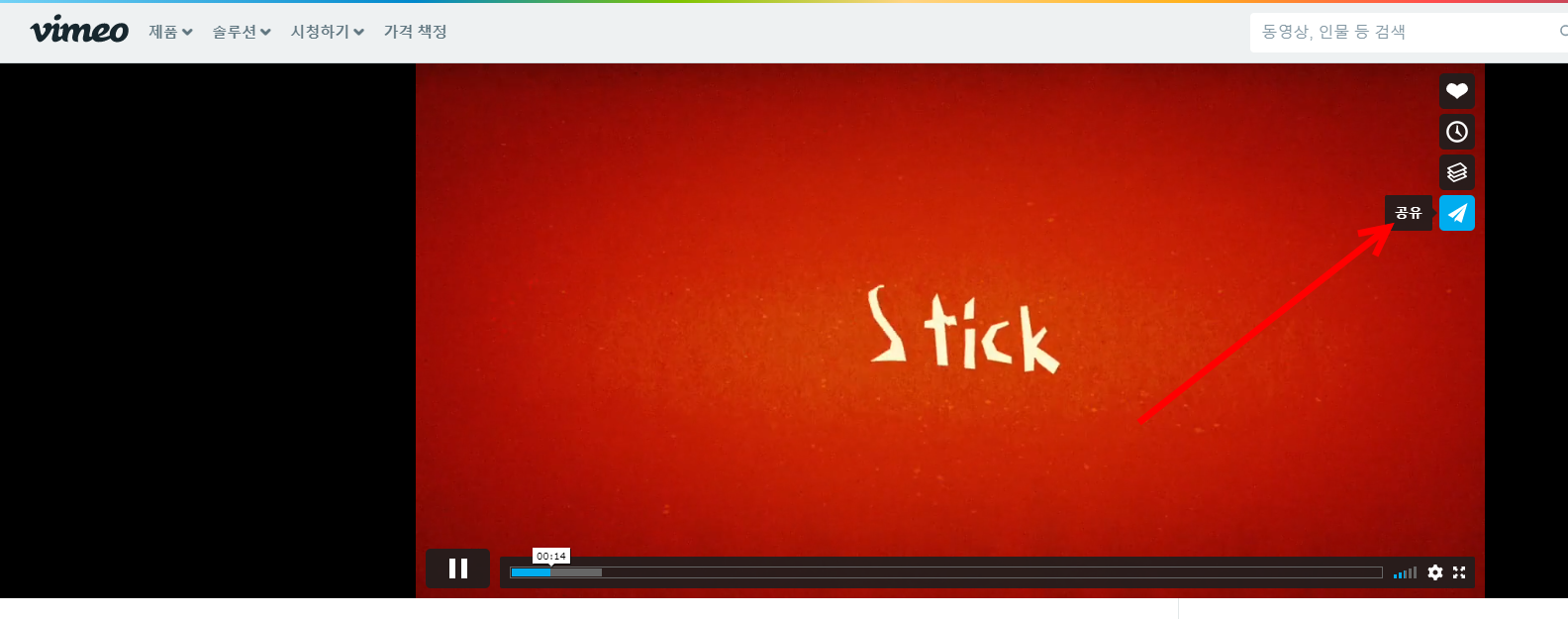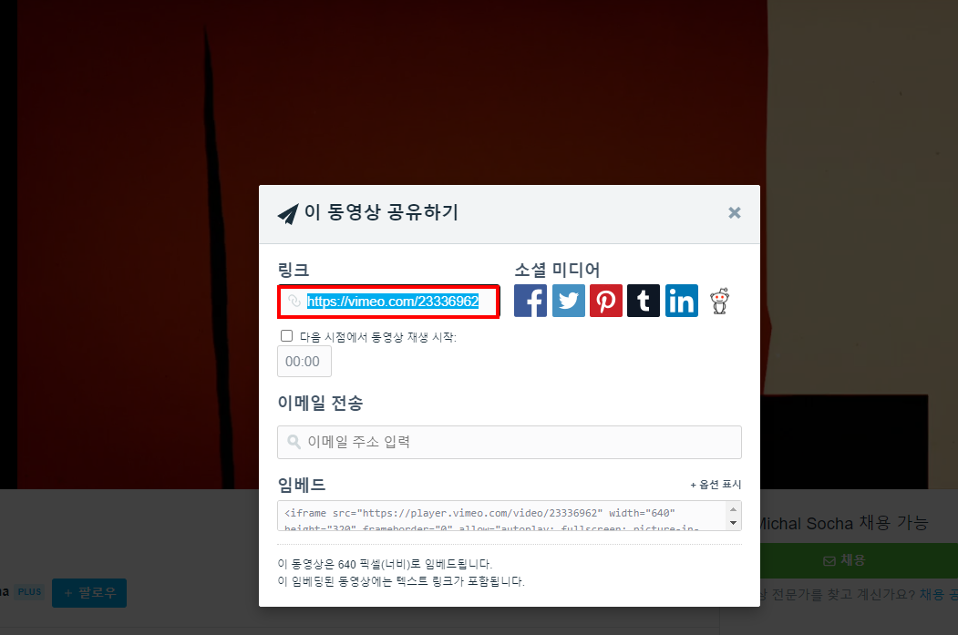 9)vimeo 웹사이트의 동영상에서 공유를 선택한다.