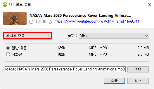 6)오디오 추출을 선택하면 동영상의 오디오 파일을 저장한다. mp3, m4a, ogg 오디오 포맷을 지원한다.
