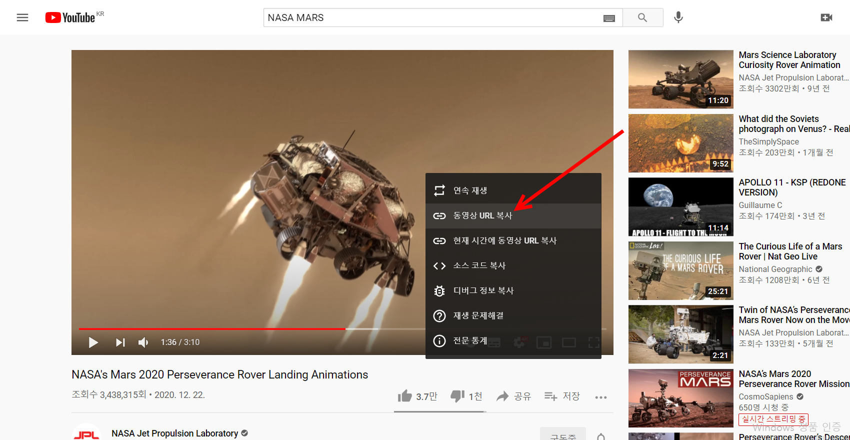 2)유튜브 동영상에서 동영상 URL를 복사한다.