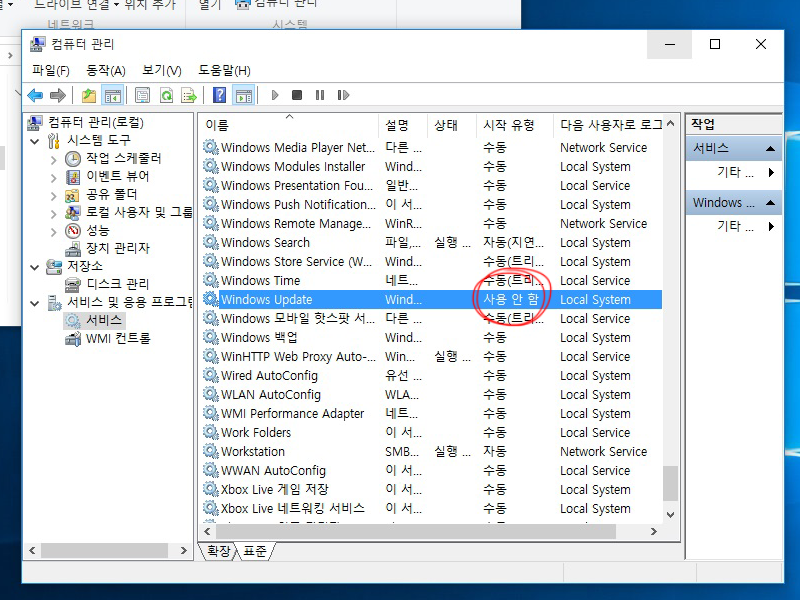 6)windows update항목이 사용안함으로 설정된것을 확인할수있다.