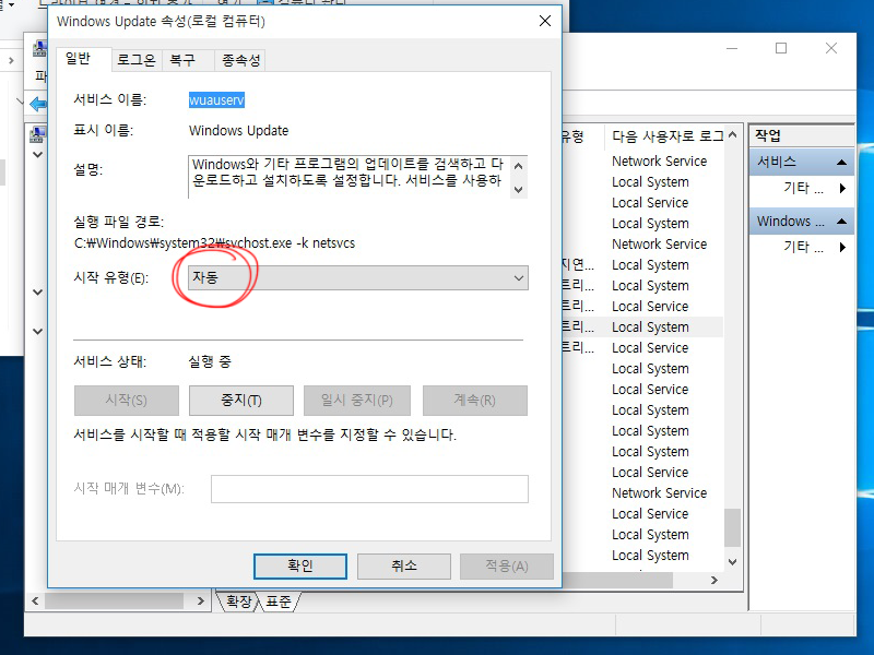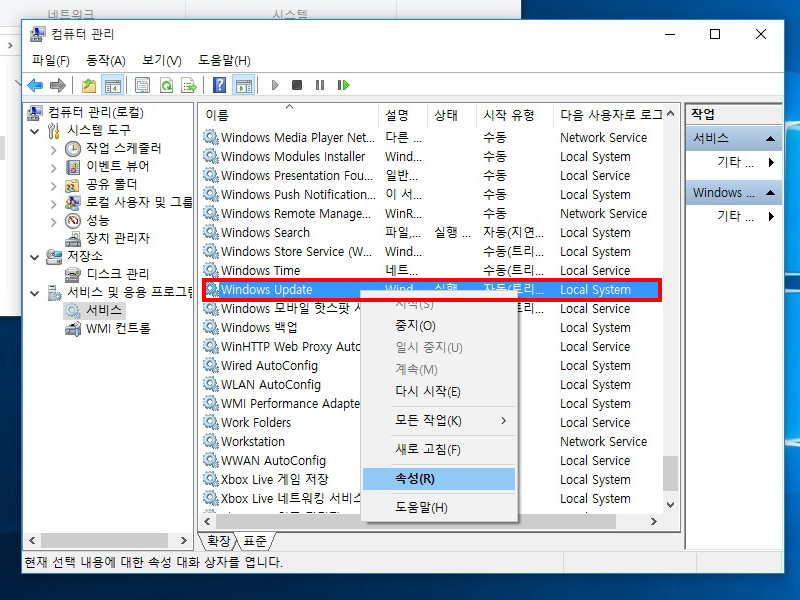 3)서비스 항목중 windows update를 선택하고 속성으로 이동한다.