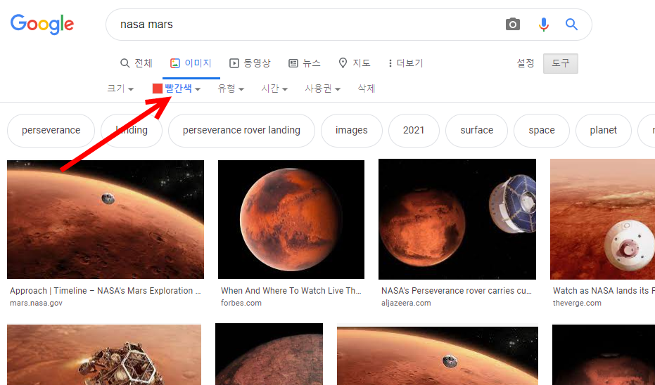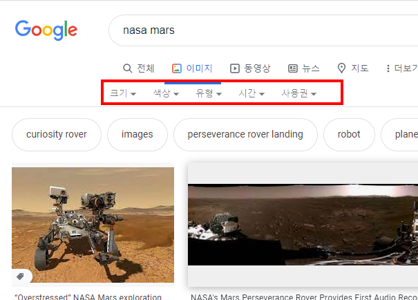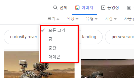 3)이미지 검색에 대한 추가 옵션이 표시되는것을 확인할수있다(크기, 색상, 유형, 시간, 사용권)