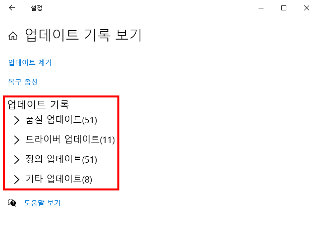 3)최근의 윈도우 업데이트 기록을 확인할수있다(품질, 드라이버, 정의, 기타 업데이트)