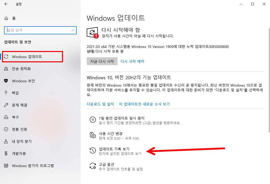 2)windows 업데이트 메뉴에서 업데이트 기록 보기로 이동한다.