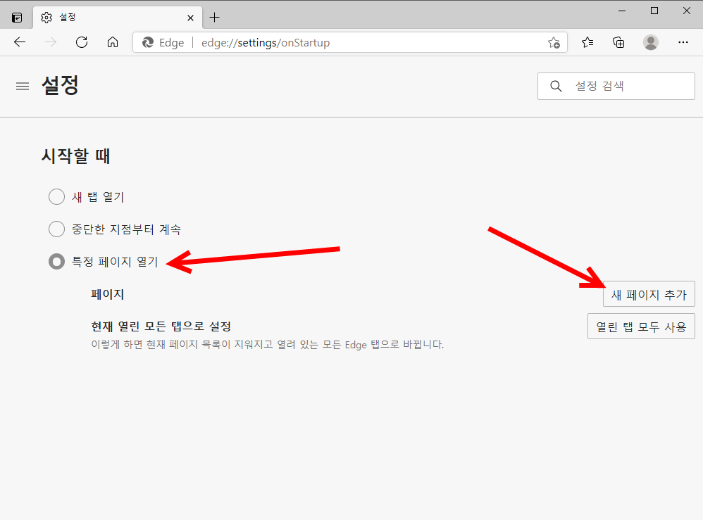 5)특정 페이지 열기에 체크하고 새 페이지 추가를 선택한다.