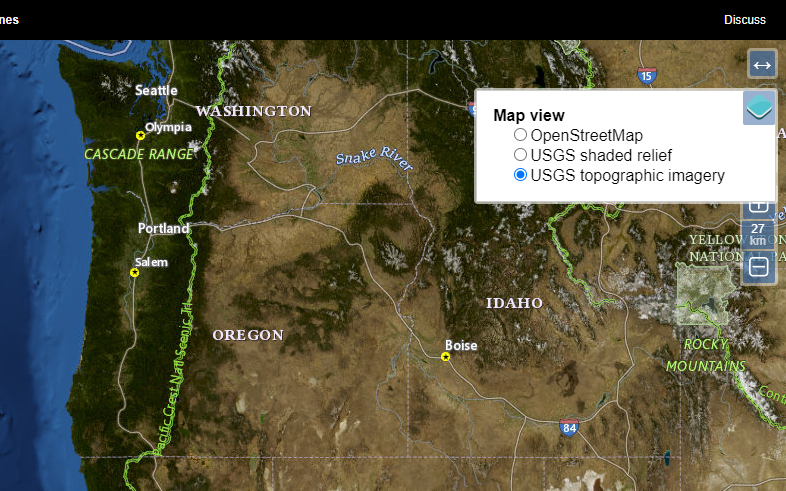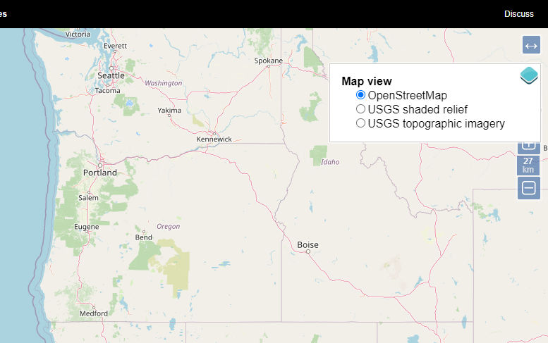 5)우측 상단에서 지도의 보기 형식을 변경할수있다(open streetmap, USGS shaded relief, USGS topographic imagery)